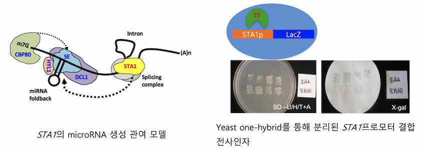 애기장대 STABILIZED1 (STA1) 유전자는pre-mRNA splicing factor인 PRP6 유사단백질을 암호화하고 있고 mRNA splicing과 stability에 관여하고 있습니다. 우리는 STA1 유전자가 splicing 기능을 통해서 small noncoding RNA (소형 비암호화 RNA)인 microRNA 생성에도 관여함을 밝혔습니다. 또 한편, STA1이 RNA-directed DNA methylation (RdDM) 에도 관여함이 밝혀져 있습니다.