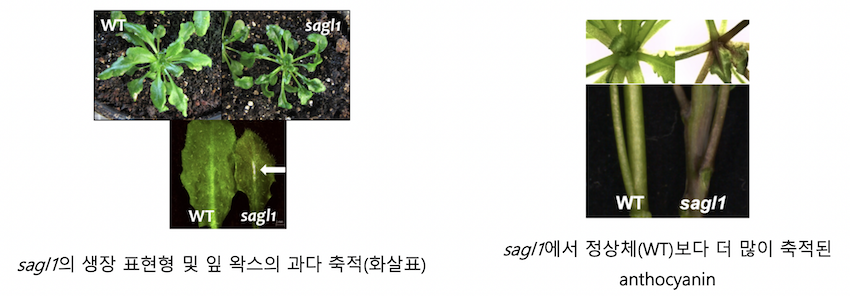 우리는 식물 형태 결함 돌연변이체인 small and glassy leaf 1 (sagl1) 애기장대 돌연변이체를 발굴하였습니다. 이름이 말해주듯이 이 돌연변이체는 작고 반짝이는,그리고 두꺼운 잎을 가지고 있습니다. 잎이 반짝이는 이유는 이 sagl1 돌연변이체의 잎 표면층에 더 많은 왁스를 축적하고 있기 때문 입니다. 또, 한편 sagl1 돌연변이체는 붉은 색소인 anthocyanin을 많이 축적합니다. 우리는 최근 이 sagl1 돌연변이체 내의 어떤 유전자가 결함이 생겨서 이러한 표현형을 보이게 하는 지를 알아 냈습니다. SAGL1 유전자의 기능 연구를 통해 잎의 왁스 축적과 anthocyanin 축적이 이 돌연변이체에서 많이 일어나는 이유를 밝혔습니다.